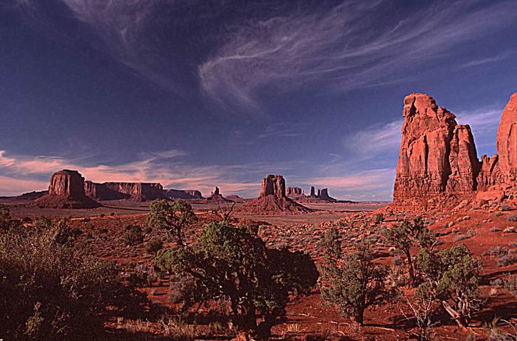 As the sun rose on my first morning in MONUMENT VALLEY, I was very impressed by the spaciousness of this immense, arid, yet overwhelmingly scenic land. My first view was from Mitten View visitor center and as the dawning light beamed its magic upon the landscape, I was awe-struck. This is primarily "wide angle" country and I found myself composing many scenes with my 24 - 70mm zoom, set at 24mm. In many instances I opted for my 20mm for more dramatic panorama. I used the wide angle lens in every way conceivable, to create compositions. At times I found my self lying on the ground, focusing on small subjects in the foreground with the expansive, sandstone cliffs as a background. Then, I might be lying on my back beneath a ledge to gain an unusual perspective of the towering cliffs against a beautiful blue sky. In many cases the great panoramic views are very straightforward, but the scenes can be dramatically altered by taking unusual angles of view as well as using all the focal lengths in a creative manner.
